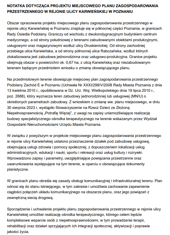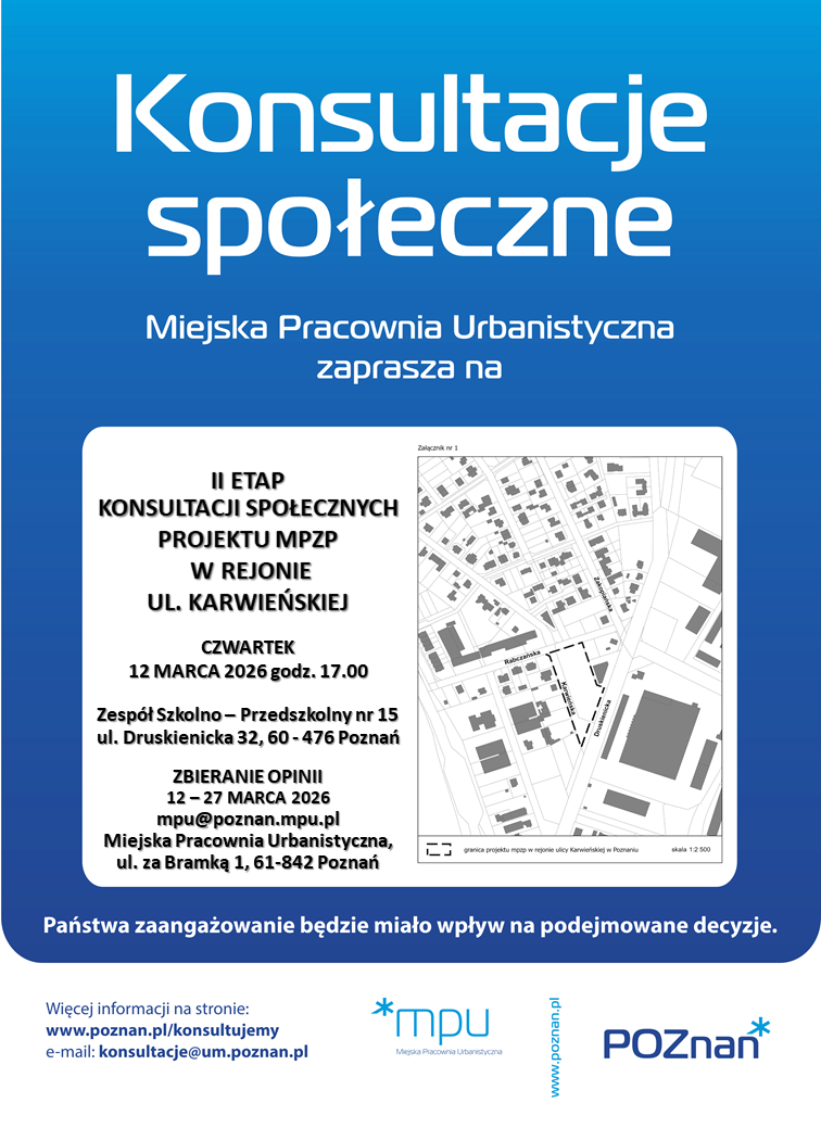 serdecznie zapraszamy na II etap konsultacji społecznych dotyczących projektu miejscowego planu zagospodarowania przestrzennego w rejonie ulicy Karwieńskiej w Poznaniu.