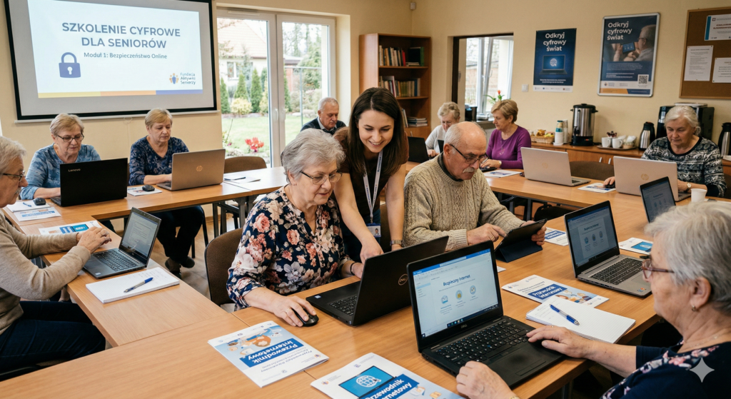 Dziś zakończyło się 16-godzinne szkolenie cyfrowe dla 12 seniorów z Podolan, organizowane przez Fundację Partycypacji Społecznej w ramach europejskiego projektu „Wielkopolska w cyfrowym świecie”. Na wstępie, w ramach modułu wyrównawczego, omówiono obsługę komputera, po wcześniejszym teście poziomu umiejętności.