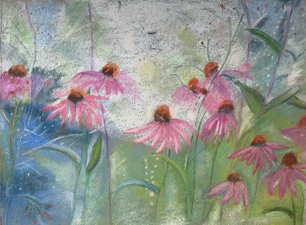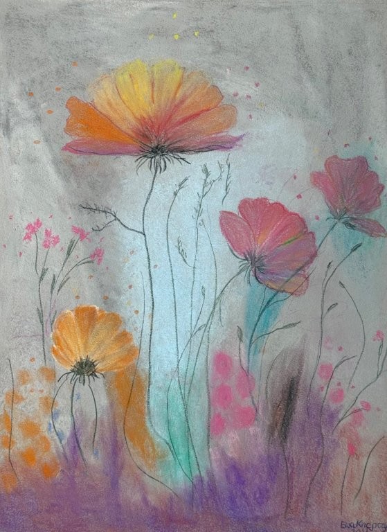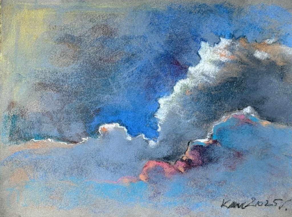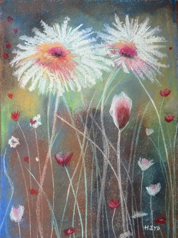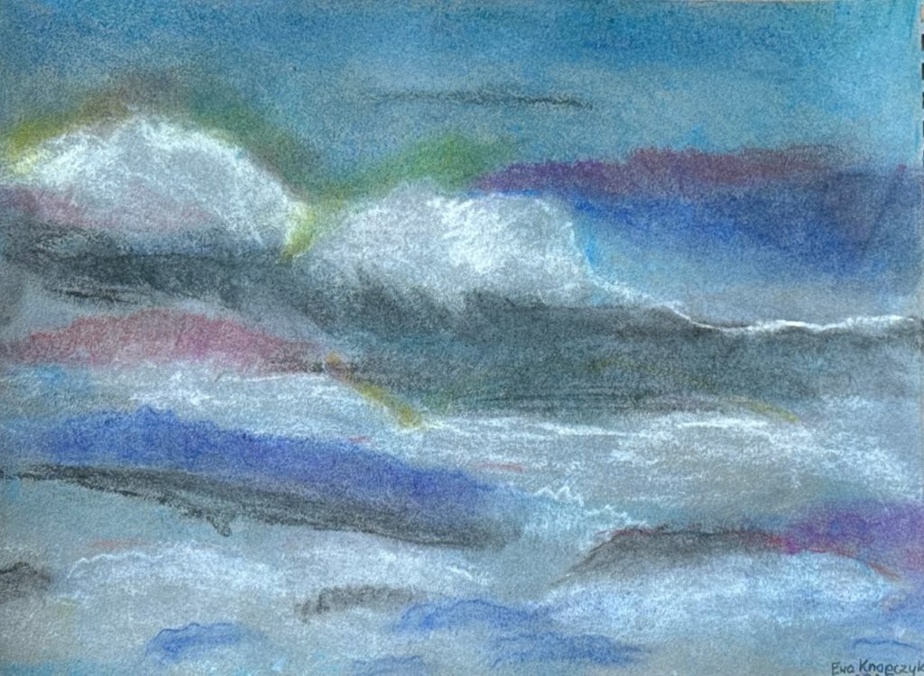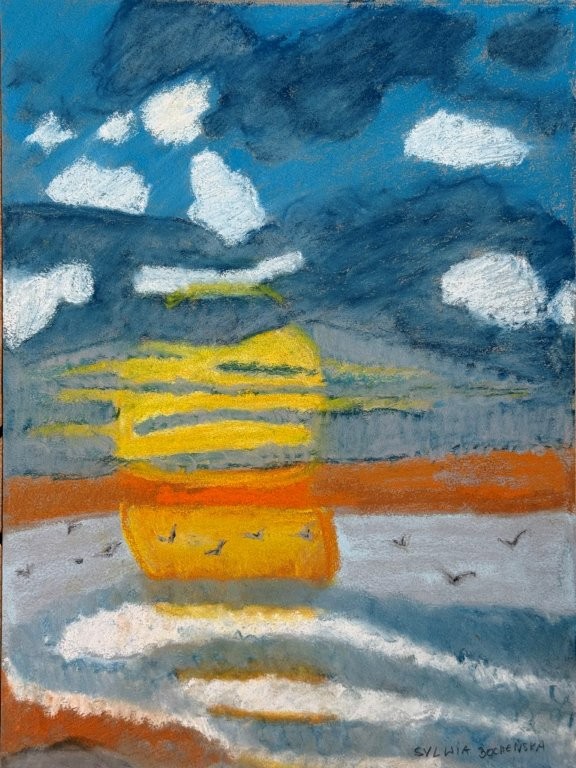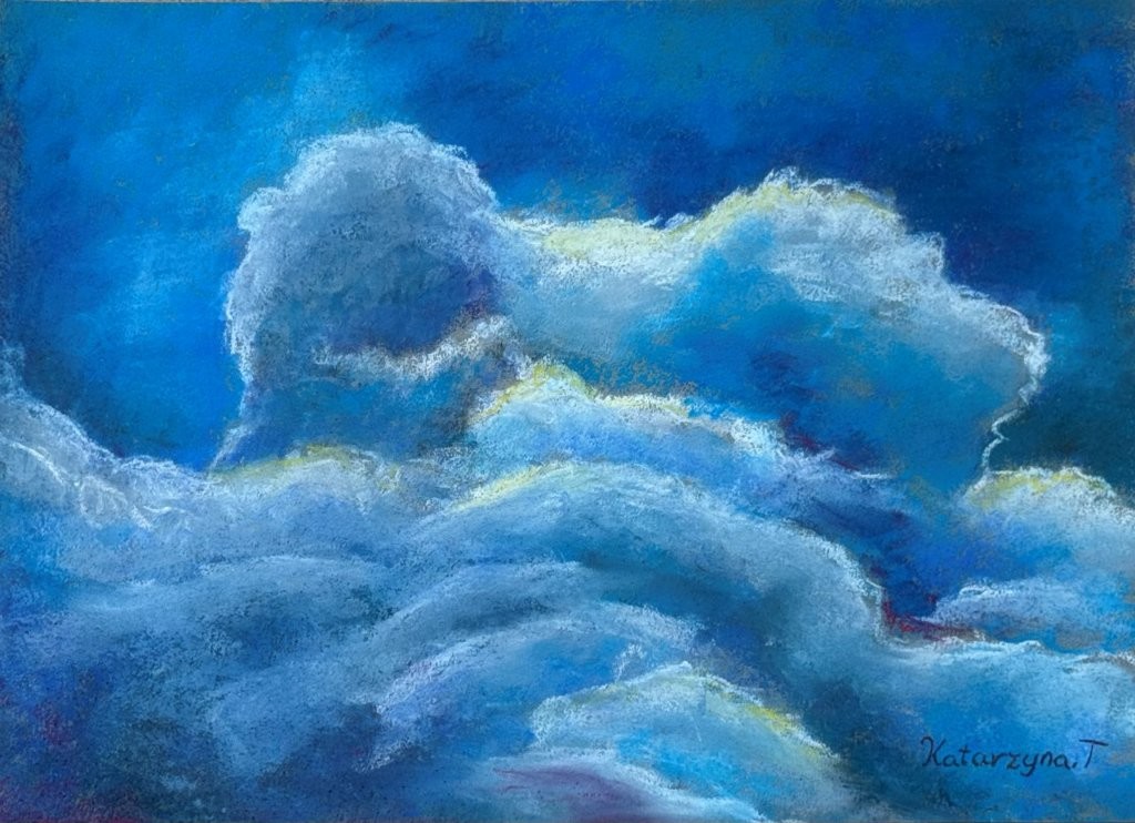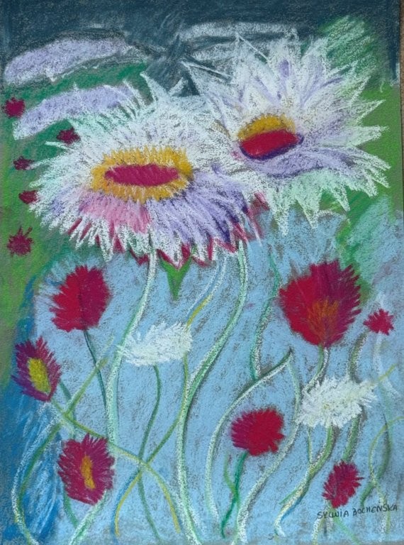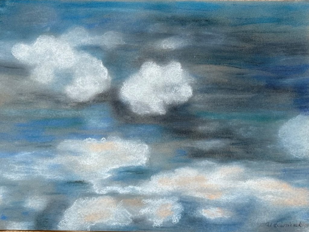Wystawa obejmuje prace w kolejnej technice, z jaką zapoznali się seniorzy podczas pleneru malarskiego w Kołobrzegu. Obok linorytu i akwareli, wykonywano również prace w formacie A3 w technice pastelu suchego, którego tematyką były kwiaty i chmury. Podobnie jak akwarele i linoryty, prace wykonane w technice pastelu suchego wymagają oprawy pod szkłem lub pleksi.