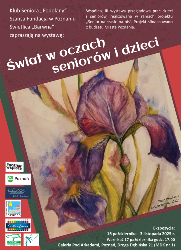 Klub Seniora „Podolany” – Pracownia Rysunku i Malarstwa wraz z Szansa Fundacją w Poznaniu zaprasza na wernisaż wystawy pt. „Świat w oczach dzieci i seniorów”. Jest to juz III edycja rocznej wystawy przeglądowej naszej Pracowni za rok 2025 oraz Swietlicy „Barwna” nad którą sprawuje pieczę Szansa Fundacja w Poznaniu. W tym roku dołączono prace malowane akrylami i na jedwabiu przez dzieci do lat 15 podczas półkolonii letnich organizowanych porzez Fundację.