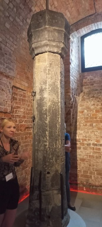 Obejrzeliśmy piwnice i parter( okres od X- XVI wieku ). Poznań prawa miejskie uzyskał w 1200 r. Zapiski wskazują, że ok. 1310 roku w Ratuszu odbywał się handel, funkcjonowały restauracje, więzienie, sala tortur, Loża Sądowa. W sali tortur znajduje się oryginalny pręgierz z 1535 roku. Obecny pręgierz widoczny na Starym Rynku między Ratuszem a domkami budowniczymi jest kopią. Na górze umieszczona jest postać kata z uniesionym w górze mieczem. W tej sali również znajduje się spiżowy dzwon, który obwieszczał ważne wydarzenia miejskie, m.in. ogłaszano publicznie wyroki. Pręgierz wybudowano z kar nakładanych na służące za zbyt stronę ubiory. Wśród wystawionych w piwnicach artefaktów ciekawy był tłok pieczętny z XIV wieku z herbem miasta,- odcisk pieczęci można zobaczyć na płytach , na studzienkach na ulicach miasta.